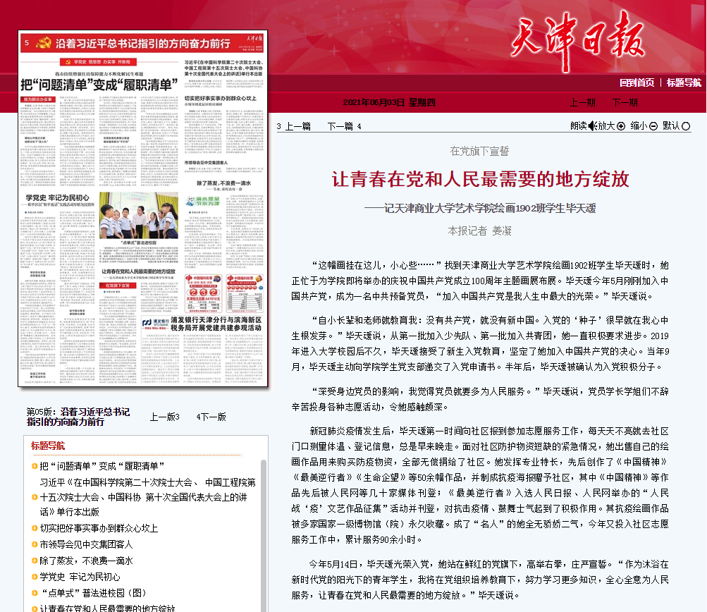 6月3日,《天津日报》(05版)以“让青春在党和人民最需要的地方绽放”为题,报道公司绘画1902班员工毕天叆的先进事迹。今日头条、北方网同步转发。