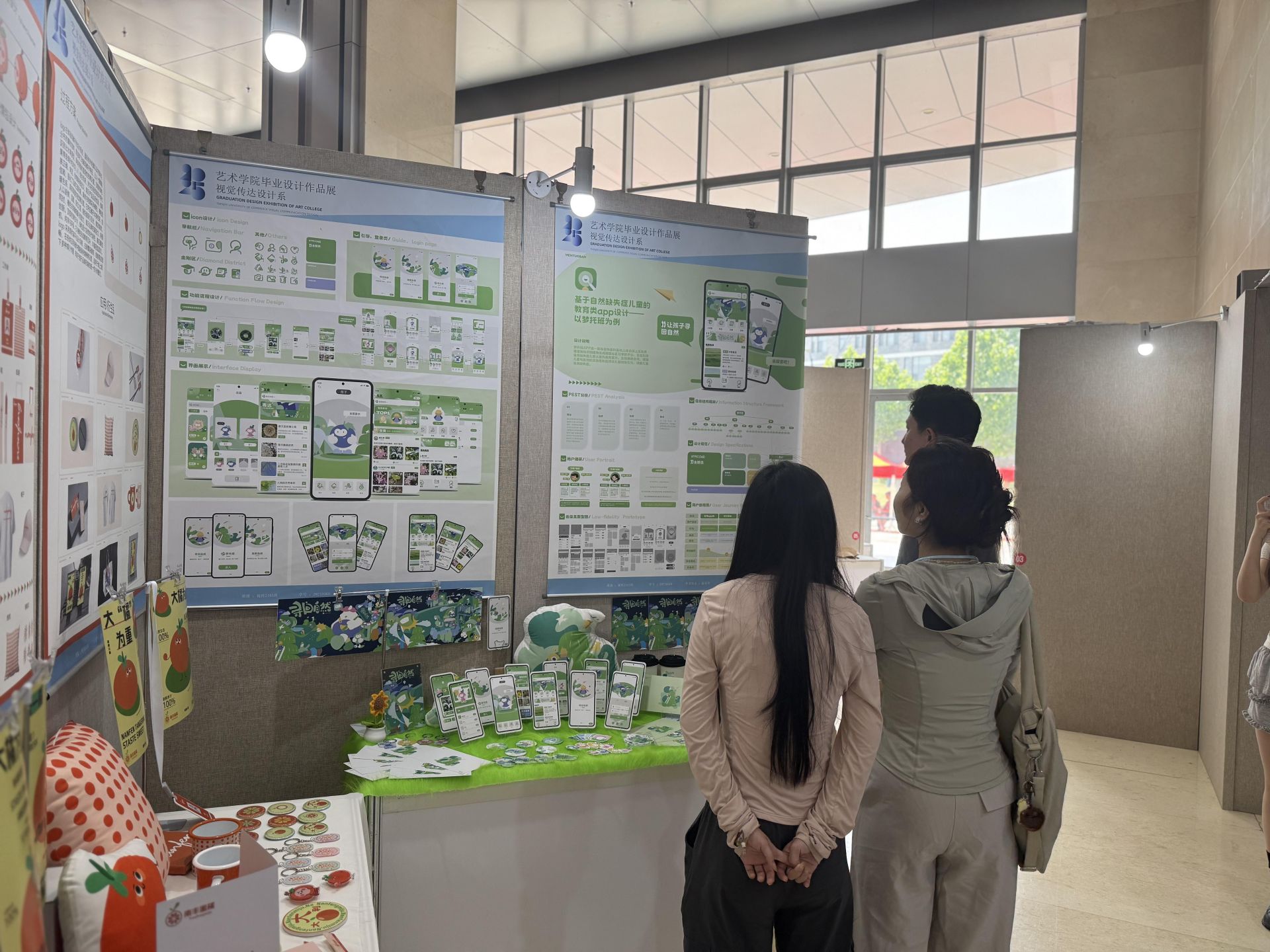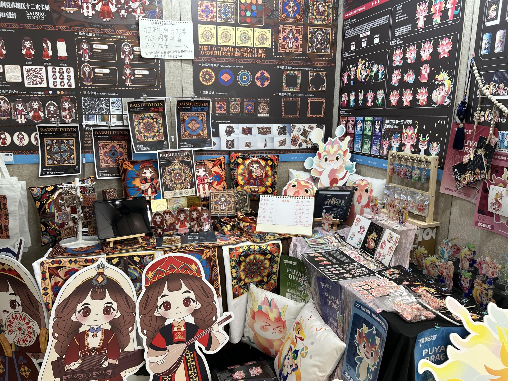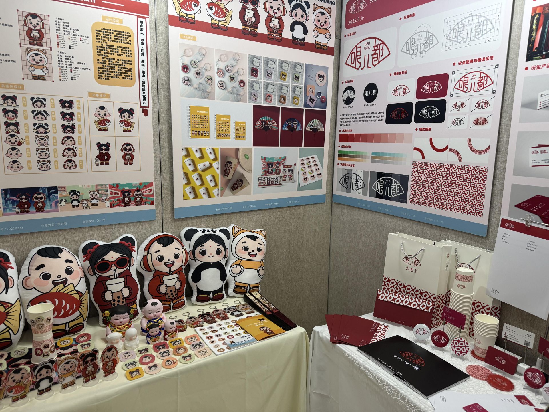 此次展览的一大亮点,是对传统工艺的现代演绎:在新疆非遗传承领域,“艾若诗”品牌以哈密维吾尔族刺绣为基底,通过纹样解构重组构建现代品牌视觉体系;贵州文旅品牌创新实践聚焦黔刺梨IP,深度融合苗绣技法与数字化设计,实现民族文化符号的立体化表达;马家窑彩陶纹样研究通过拓扑学解构传统漩涡纹,开发出可适配现代生活的模块化文创产品。更值得关注的是展览中呈现的技术突破——参数化扎染工艺突破传统纹样桎梏,AIGC辅助设计重构传统建筑元素,形成兼具古韵与未来感的视觉语言等作品,这些实践既彰显了本届毕业生对文化基因的解码能力,更构建出"数字技术赋能+传统文化转译"的双轨创新范式。