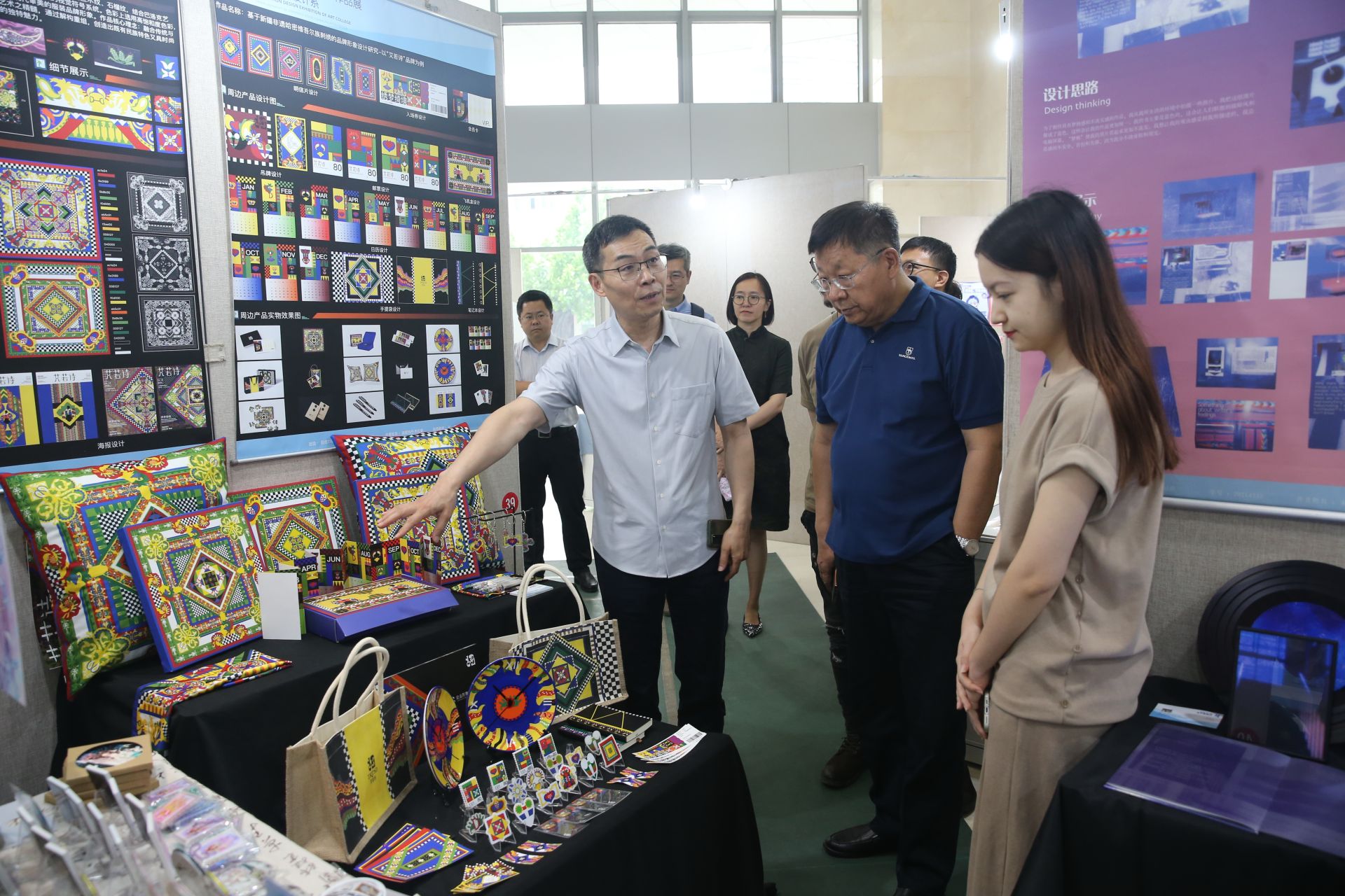 张亚、齐恩平在观展过程中,逐一驻足观赏各展区作品,认真听取创作者对设计理念、工艺技法及文化内涵的阐述。在互动交流环节,校领导对毕业生将传统文化元素与现代设计语言有机融合的创作方向表示高度肯定,特别指出本次展览既体现了艺术教育的育人成果,更展现出青年学子对社会热点的敏锐洞察,作品在艺术性、思想性与技术性层面均达到较高水准。