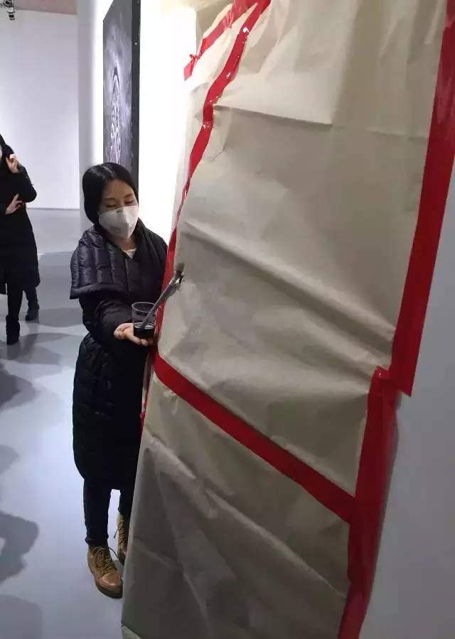 第四场萧勍的行为艺术《墨》,艺术家将自己密闭于宣纸壳子里,吸管戳破纸壳,伸入墨水杯,吸食干净。