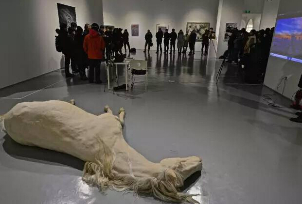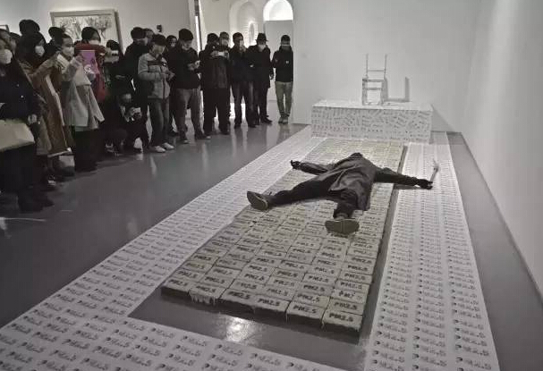 第一场公众行为艺术《死于霾》,到场者佩戴口罩横躺于展厅,死亡十分钟。
