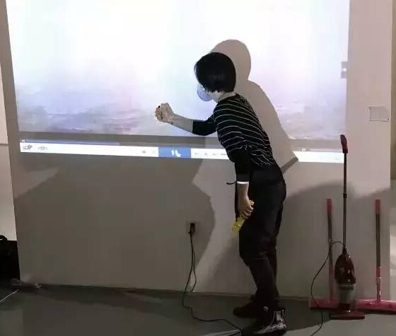 第二场王戎行为影像《霾斗》,艺术家用吸尘器将投到墙上充满雾霾的影像慢慢变成晴朗的天空。