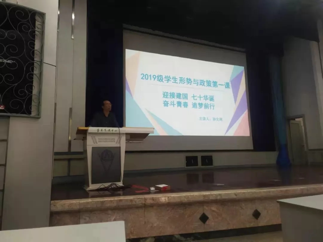 2019级新生开学典礼于2019年9月4日在学术交流中心举行。在开学典礼上党委书记孙文利为新生们上了开学形势与政策第一课。本次形势与政策课以“迎接建国,七十华诞;奋斗青春,追梦前行”为主题,以新中国成立70周年以来的几个大伟大历史节点为切入点,讲述了我们的祖国成立70周年以来,在军事、政治、经济、文化等取得的瞩目成就。要求2019级新同学们牢记习近平总书记对青年的殷切希望,坚定信仰,厚植爱国情怀,树立远大抱负,脚踏实地,开拓创新,乐观豁达,不怕逆境,把中国梦、青春梦、艺术梦统一起来,圆梦青春,圆梦新时代。